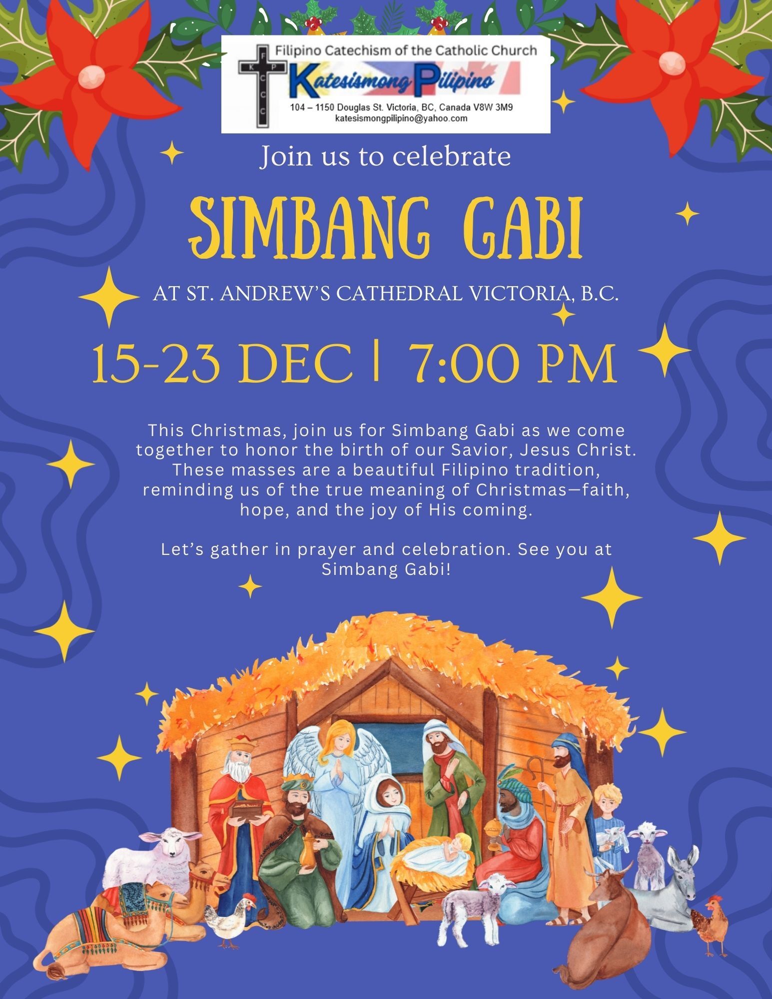 2) All are warmly invited to join Katesismong Pilipino (KP), the Filipino Catechism community of the Catholic Church in Victoria, for Simbang Gabi 2025, held December 15–23 at 7:00 pm at St. Andrew’s Cathedral. Simbang Gabi, meaning “Night Mass,” is a cherished nine-day devotional tradition celebrated by Filipino Catholics as a joyful preparation for Christmas. Everyone is welcome to come and share in this prayerful and festive season of faith.